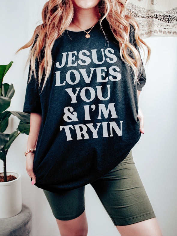 Jesus Loves You & I'm Tryin' | Scripture T-Shirt | Ruby’s Rubbish®